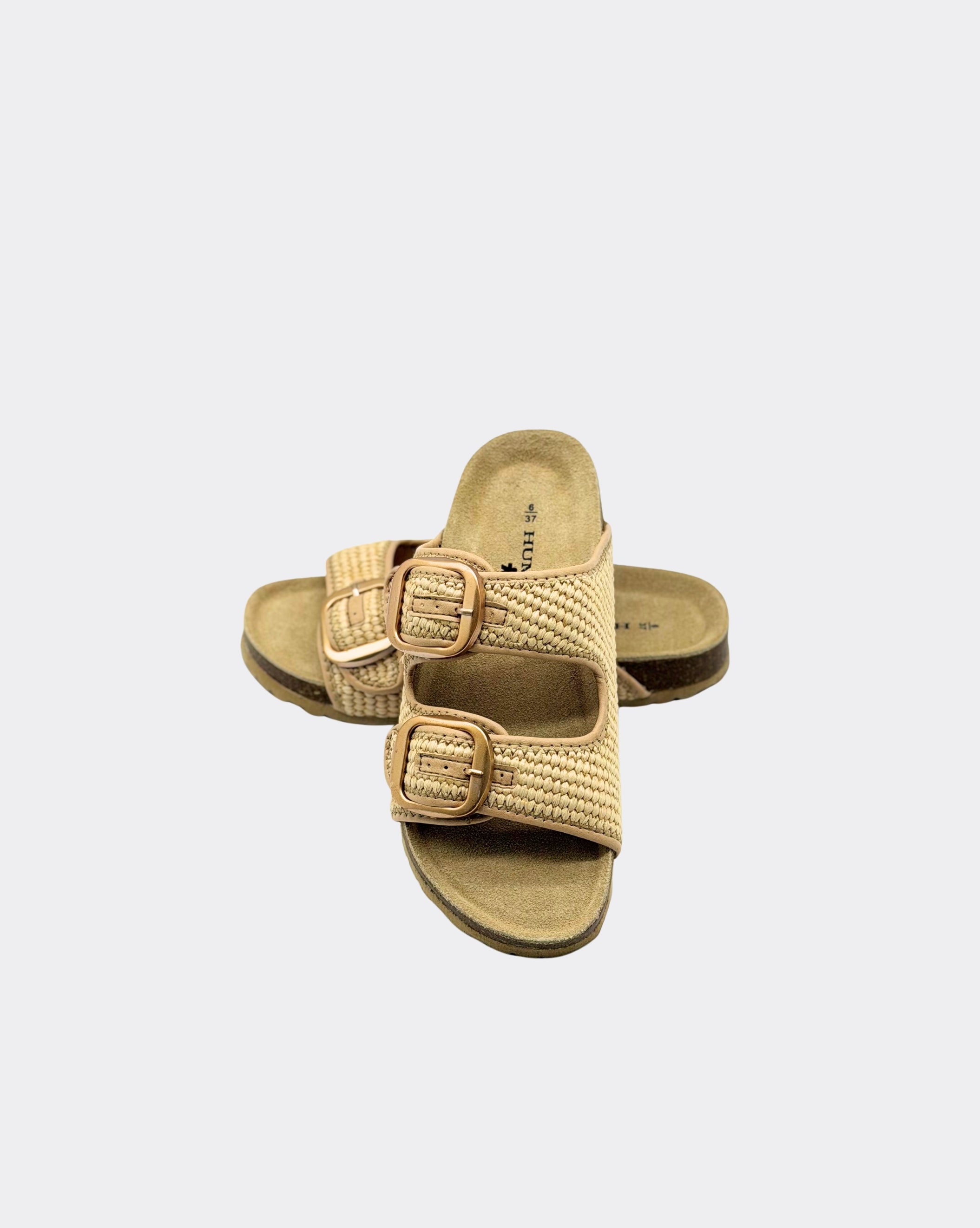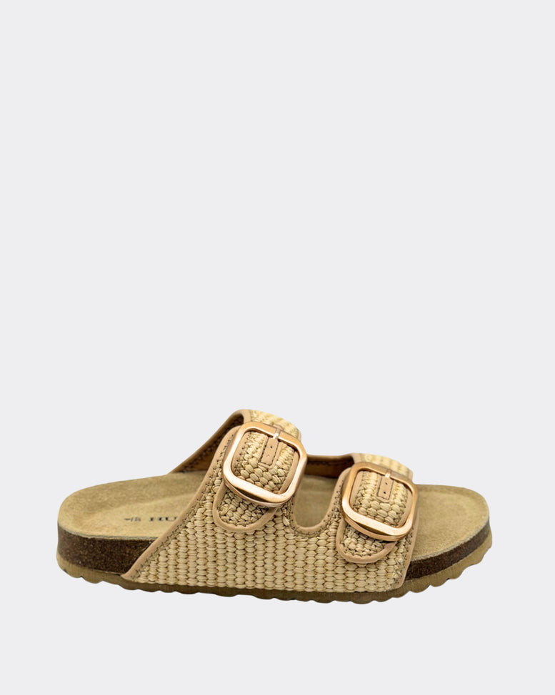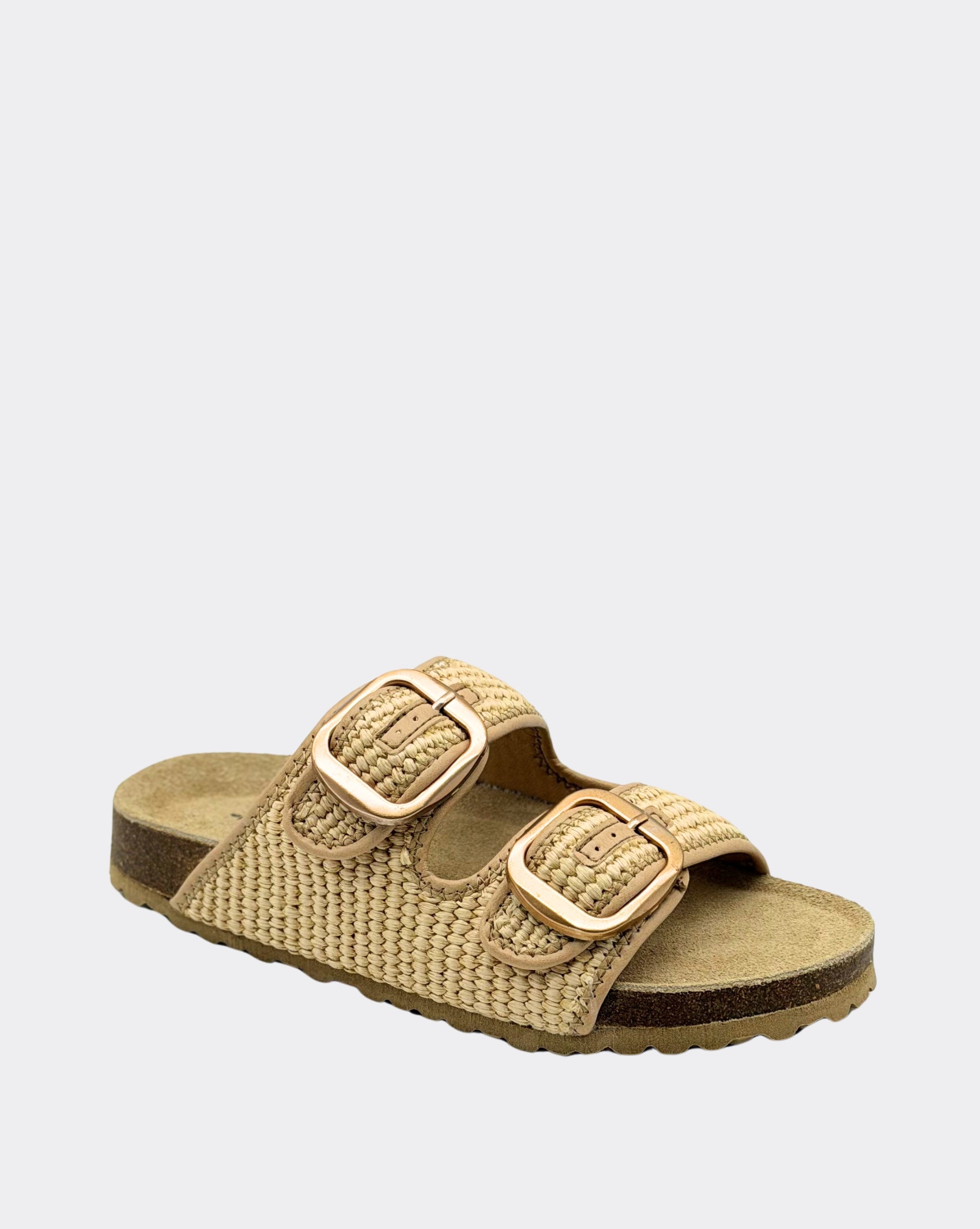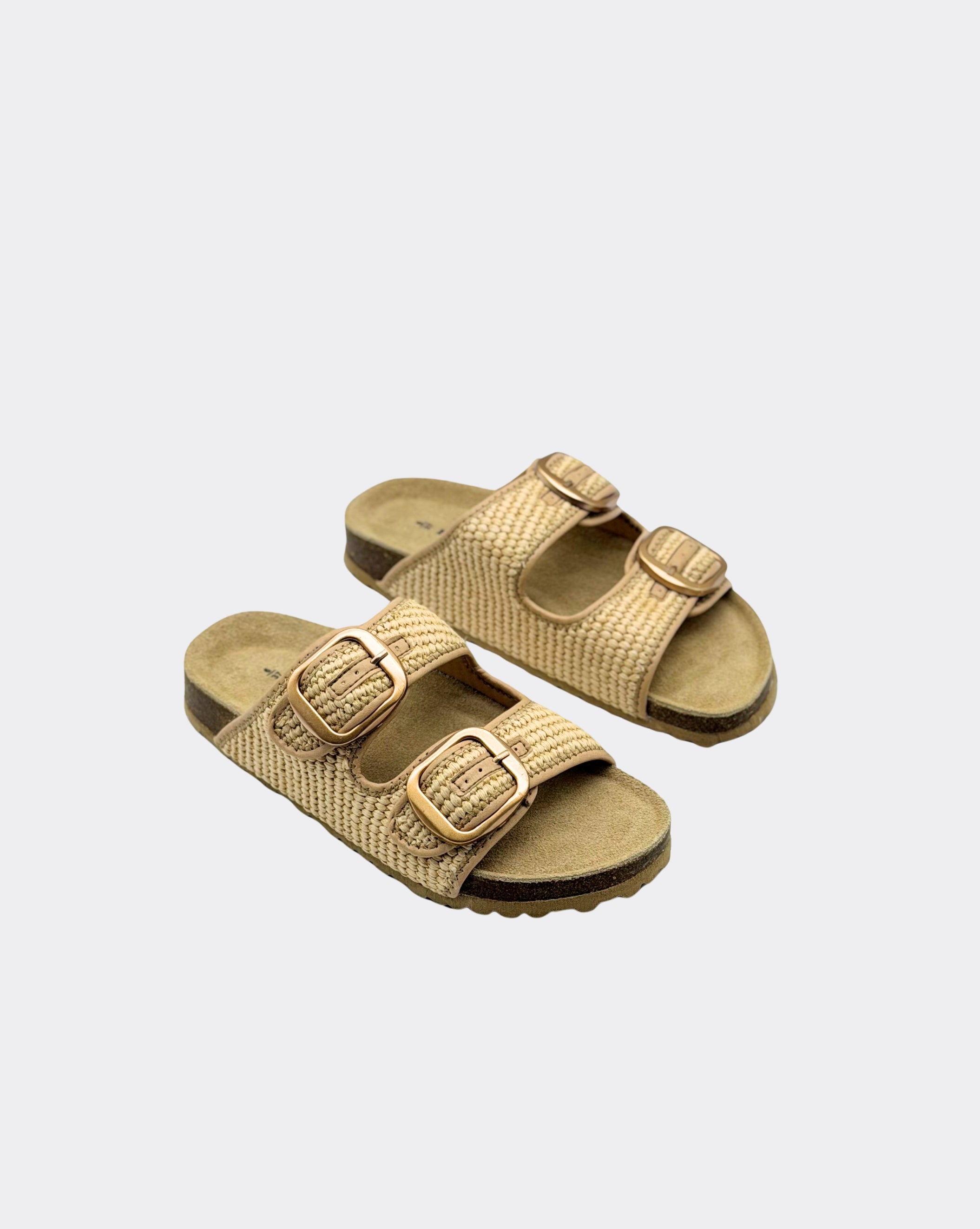 on-trend raffia upper with adjustable double-buckle closures on a moulded footbed.